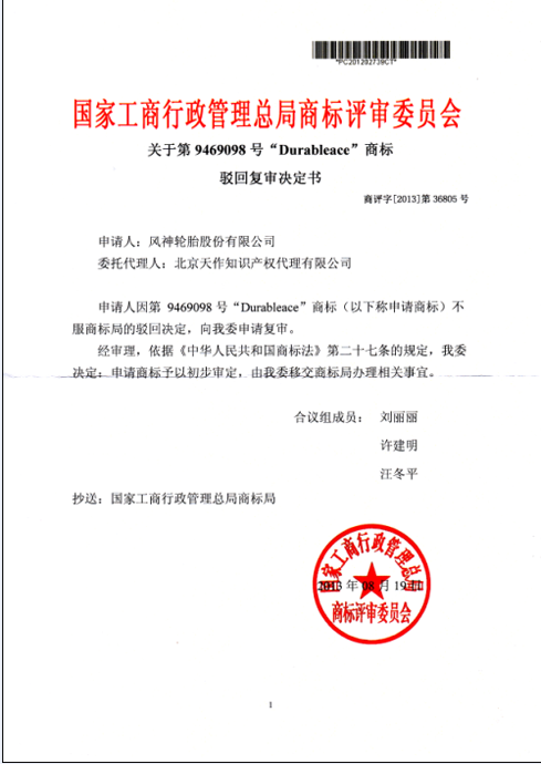 北京天作知识产权代理有限公司代理河南知名品牌“风神轮胎”的驳回复审获得商评委的支持,申请商标被核准注册。