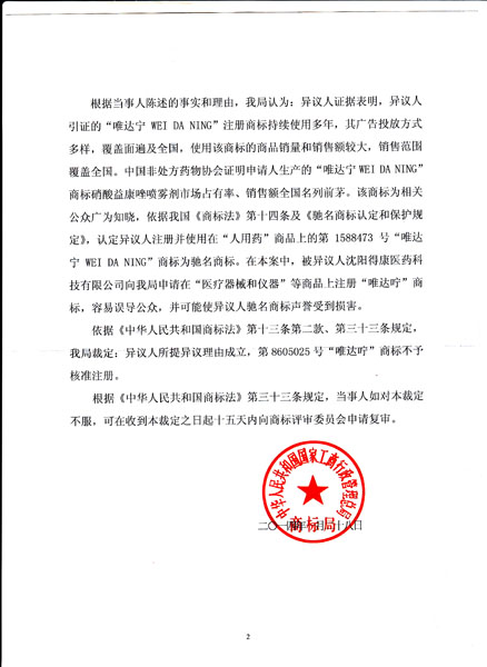 天作代理修正对注册在“医疗器械和仪器”等商品上的商标“唯达咛”的异议成立,体现了新商标法中关于驰名商标的保护精神,体现了对大品牌的保护,下为异议裁定书: